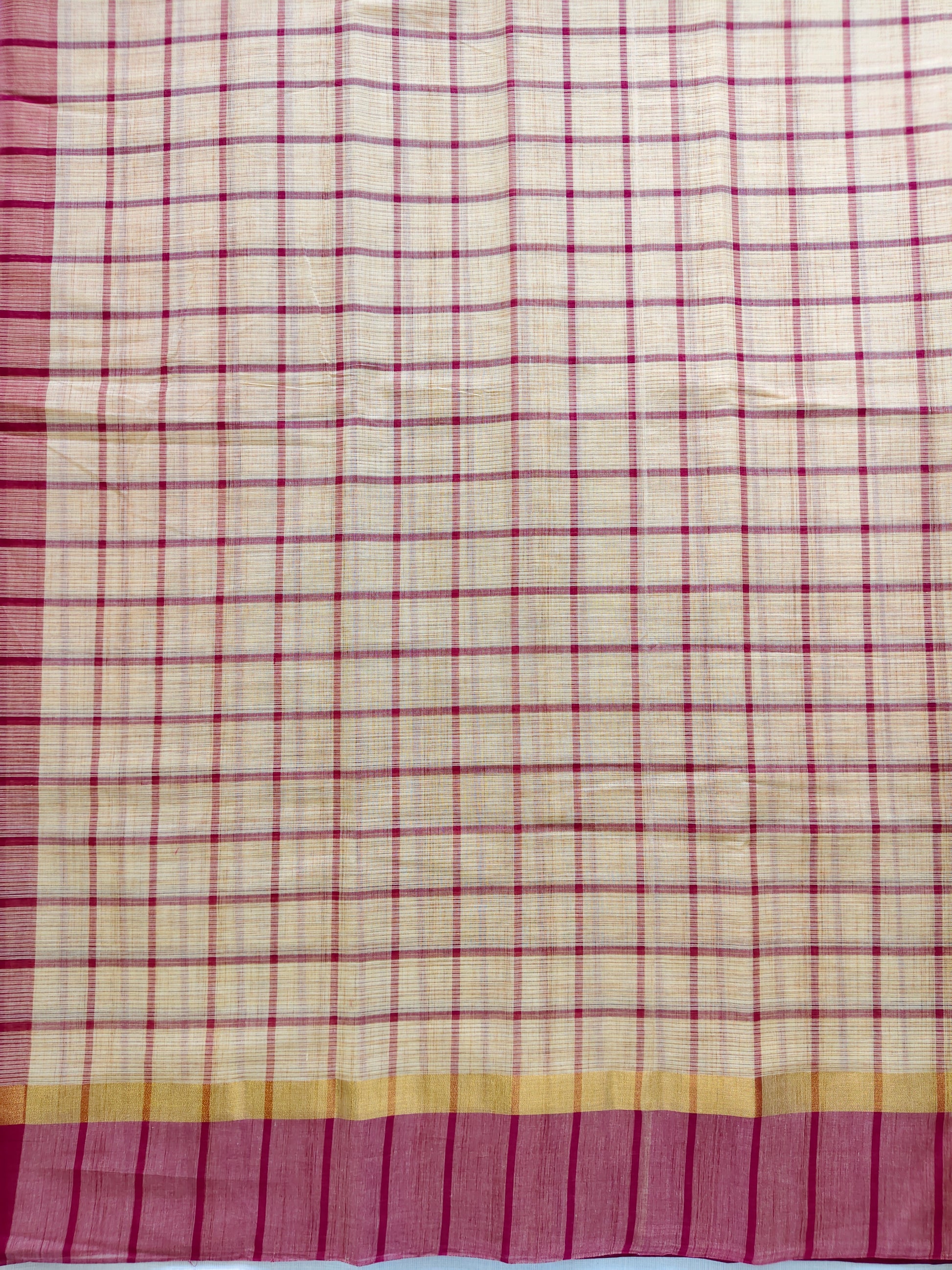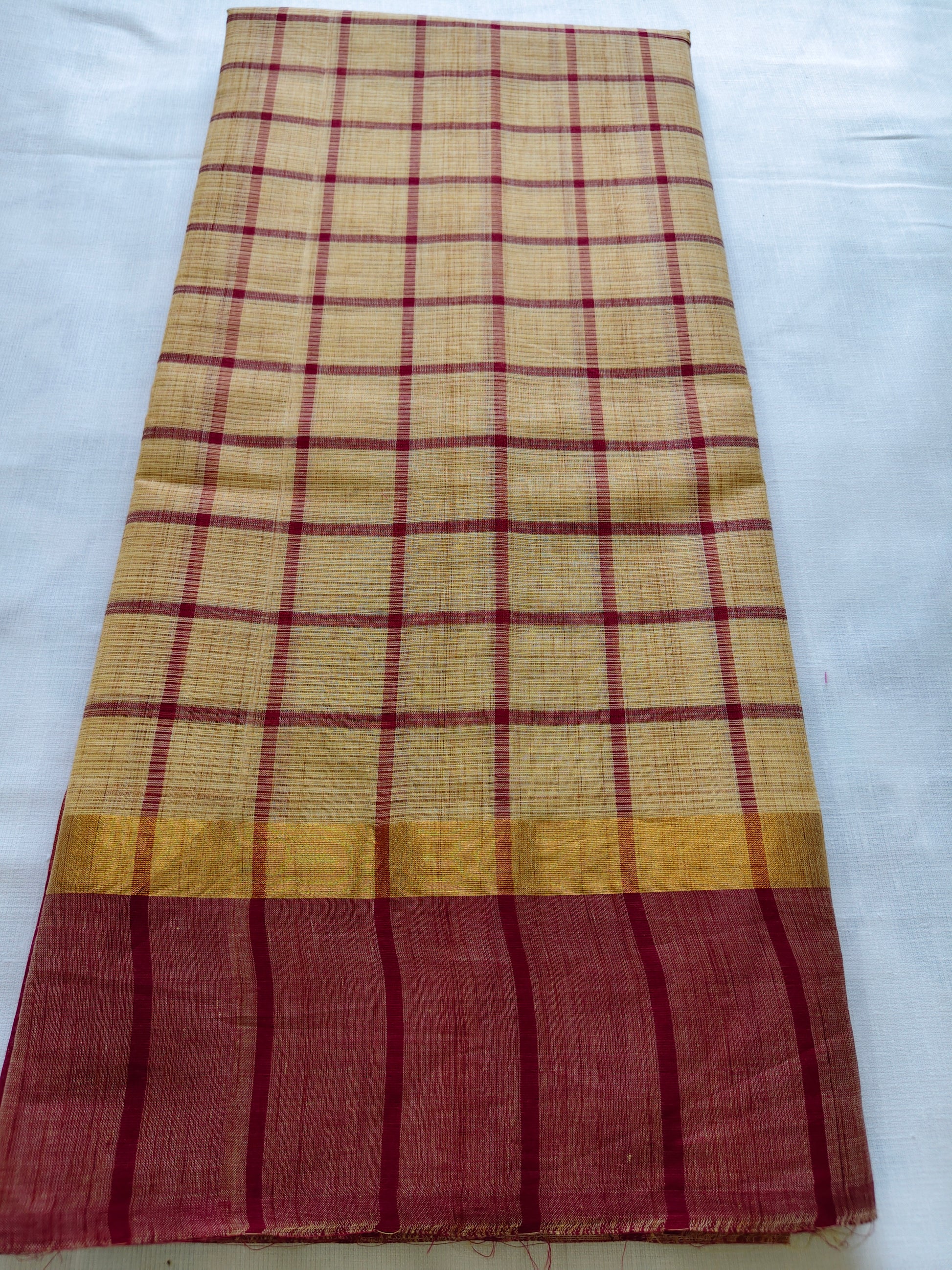 This South Indian cotton saree features classic maroon checks on a soft sand brown base, finished with a contrast border and subtle golden zari detail. Comfortable, lightweight, and ideal for daily and office wear.
